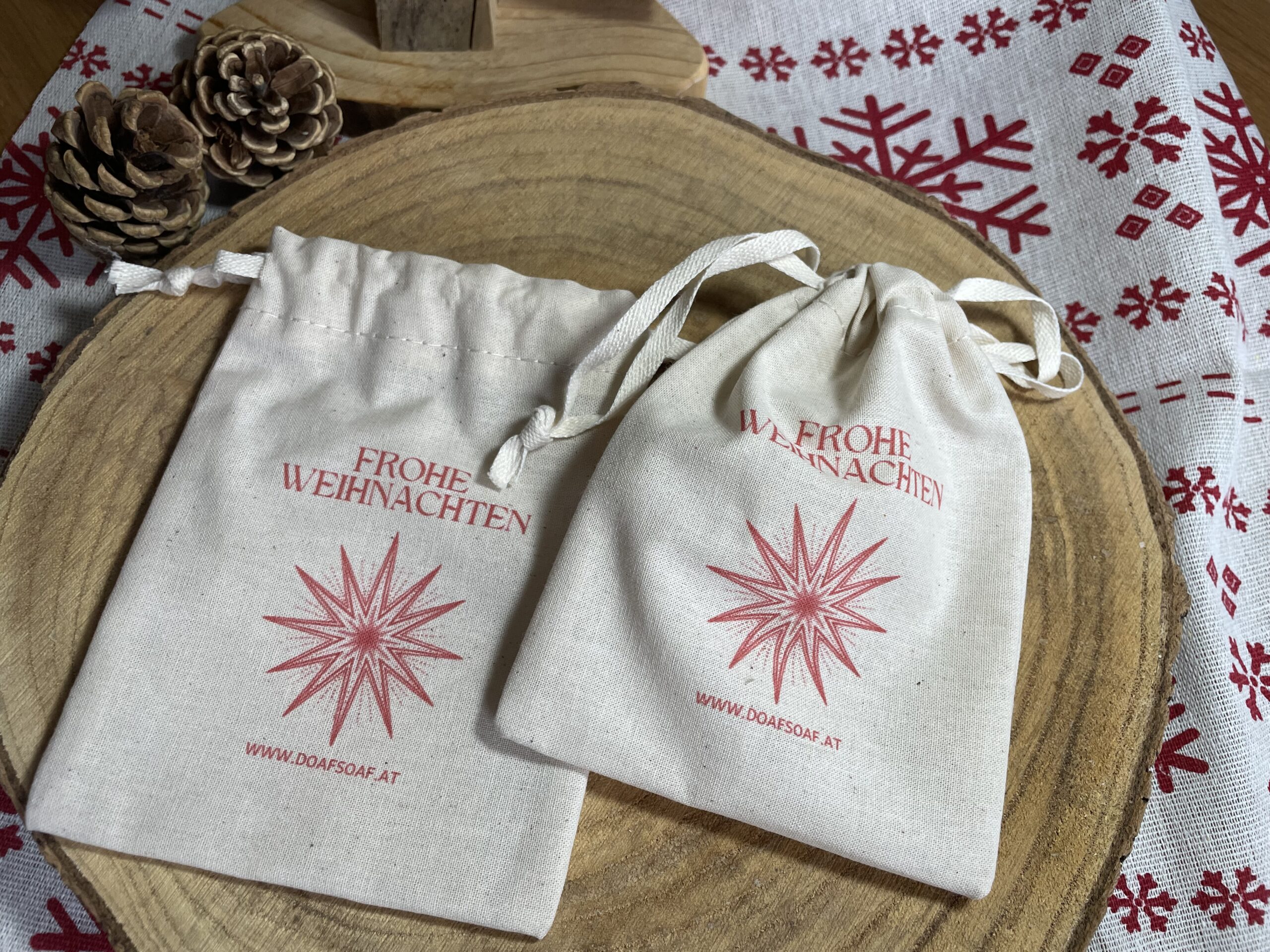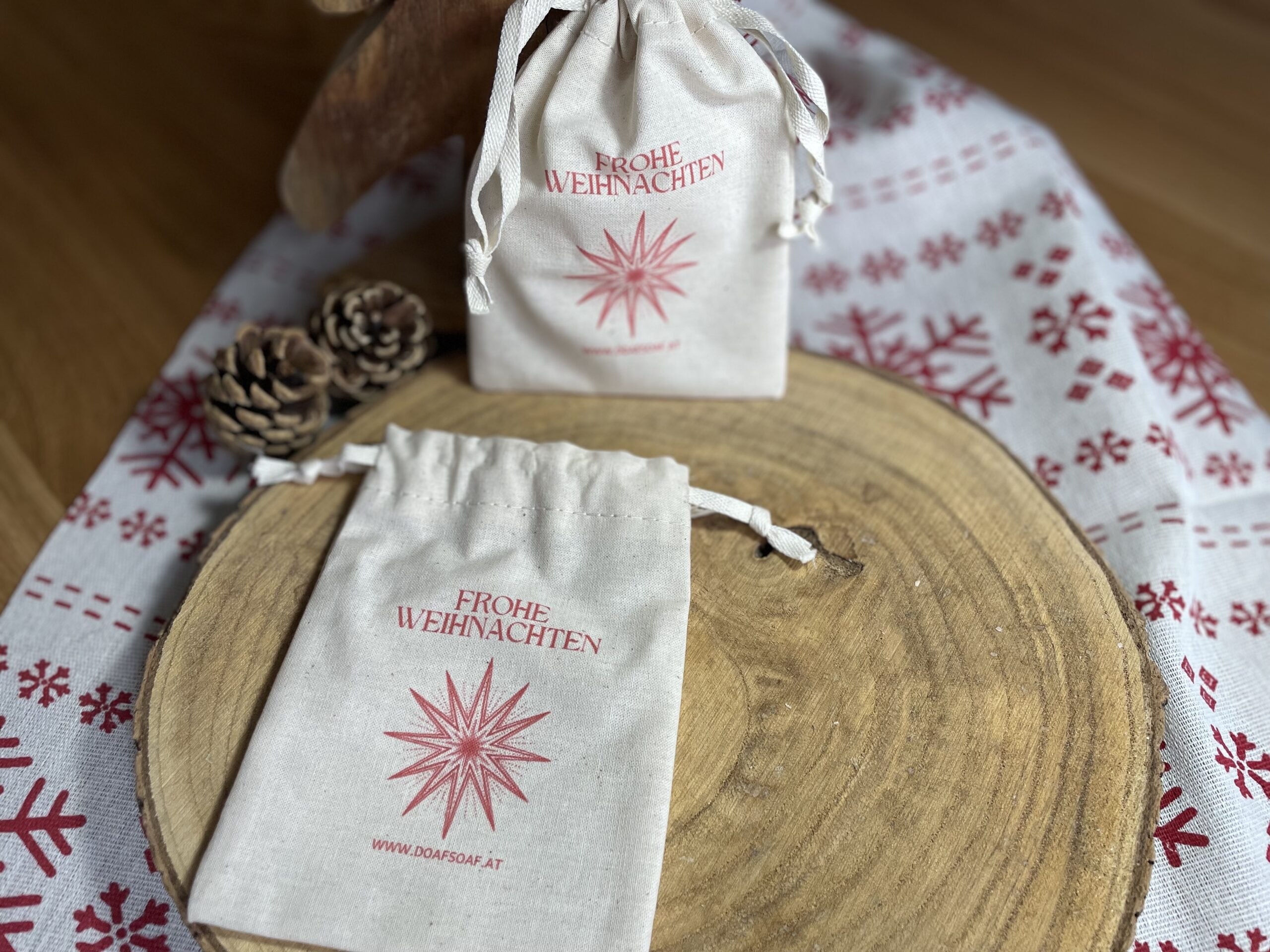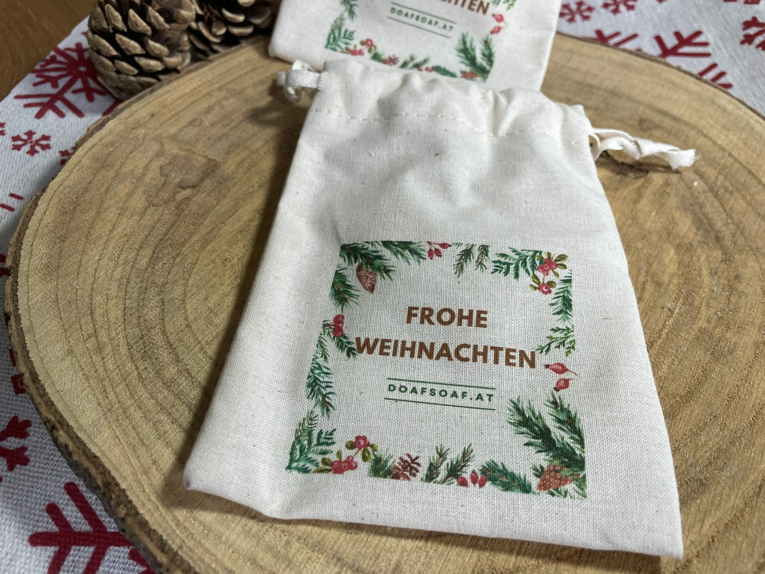 Das Baumwollsäckchen mit Zugbändchen ist die perfekte Verpackungslösung für ein Stück Naturseife, eine Lippenpflege, eine Badekugel oder für sonst eine kleine Aufmerksamkeit. Dieses weihnachtliche Säckchen rundet das Geschenk liebevoll ab und macht es zu etwas Einzigartigem.